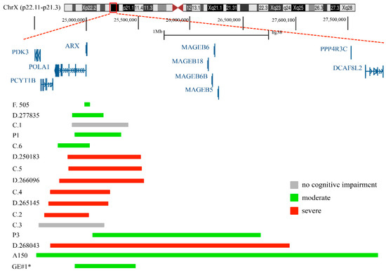 Popovici et al. [21] reports on four duplications of Xp21.3. Two of them, a 440 Kb and a 580 Kb duplication, included the full copies of POLA1 and ARX genes and were found in two males with syndromic ID (case 2 and case 4; Table 1); meanwhile, the remaining two—a 540 Kb duplication, which included a full copy of the ARX gene, and a 630 Kb duplication, which included full copies of Phosphate cytidyltransferase 1 choline beta isoform (PCYT1B; MIM 300948), POLA1 and ARX—were found in two males with diagnoses of normal intelligence (case 1 and case 3; Table 1). In addition, the authors define two other duplications reported in public databases: a 720 Kb de novo duplication that contained a full copy of PCYT1B, POLA1 and ARX genes, identified in a boy with syndromic ID (case 5, reported by DECIPHER https://www.deciphergenomics.org/, accessed on 31 January 2022); and a 290 Kb duplication covering partial POLA1 and ARX genes, identified in a patient with developmental delay (reported by the ISCA consortium; case 6; Table 1).