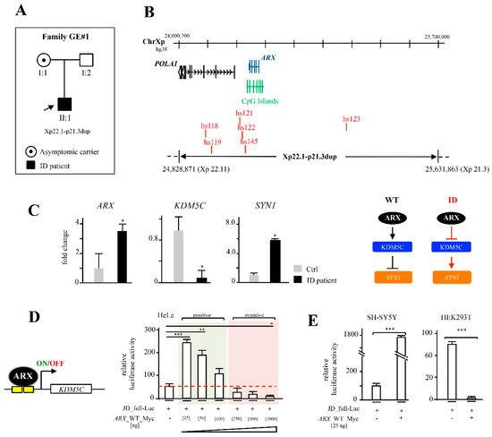 Identification of a novel ARX duplication and its functional implications. Genealogical tree of family GE#1 and segregation of Xp22.1-p21.3dup: (A) Physical map of the ARX duplication on the human X chromosome (ChrX). (B) The involved genes POLA1 and ARX, the CpG Islands and the ultraconserved enhancers expressed in embryonic mouse brain (VISTA Enhancer Browser at https://enhancer.lbl.gov/, accessed on 24 January 2022) are shown. ARX, KDM5C and SYN1 expression levels in GE#1 ID patient’s lymphoblastoid cell lines (LCLs) and XYWT LCLs (C). Results were normalized using HPRT1 as reference gene and shown as mean ± SD from three independent experiments. p < 0.05. Schematic representation of ARX-KDM5C-SYN1 regulatory path is shown. Dose- and cell-type-dependent activity of ARX on 5′ KDM5C regulatory region (D,E). Luciferase assay in HeLa cells at increasing concentrations of ARX and Luciferase assays in HEK293T and SHSY5Y cell lines. Data were normalized to relative luciferase activity of JD-full-Luc. Results are shown as mean ± SD from three independent experiments. p < 0.05 *; p < 0.005 **; p < 0.0005 ***.