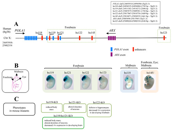 The ARX locus has a high density of forebrain ultraconserved sequences. Schematic representation of Xp region containing the multiple ultraconserved sequences located near the ARX locus, created on the annotation of UCSC hg38 assembly. Nucleotide positions are shown in box (A). Whole-mount staining images, obtained freely from VISTA Enhancer Browser (https://enhancer.lbl.gov/, accessed on 24 January 2022), showing the expression profiles of each enhancer in E11.5 embryos. Schematic representation of E11.5 brain subregions is shown in (B). Summary of phenotypic and molecular features of knockout mice lacking individual, or combinations of, ultraconserved Arx enhancers in shown in (C).
