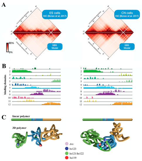Polymer physics description of the murine Arx locus. Bottom matrices and contact maps predicted from the SBS polymer model by analysing the genomic region chrX:91,000,000–95,000,000 (UCSC, mm10). HiC data were obtained from a previous study [20] (A). Binding domain distributions for ESs (left) and CNs (right) (B). Snapshots from real MD simulations describing the 3D structure in ESs (left) and CNs (right). The colour scheme used is reported in the linear bar above (C).