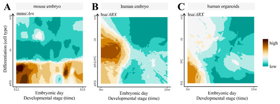Spatiotemporal gene expression trajectories of Arx/ARX across the corticogenesis: in mouse, from the embryonic stage E12 to E15 (A); in humans, from gestation week 8 to 20 (B); and in human-derived brain organoids, from in vitro developmental week 3 to 10 (C). RG, radial glia; aRG, apical radial glia; vRG, ventral radial glia; oRG, outer radial glia; IPC, intermediate progenitor cell; BP, basal progenitor; N, neuron; iN, immature neuron; mN, mature neuron. Data can be accessed freely on http://www.humous.org/, accessed on 2 February 2022.