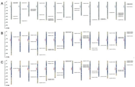 Chromosomal localization and distribution of CDPK genes in I. batatas (A), I. trifida (B), and I. triloba (C). The bars on the left margin represent chromosomes. The chromosome numbers are displayed on the left side of the chromosomes, and the gene names are displayed on the right side. Detail chromosomal location information is listed in Table S1.
