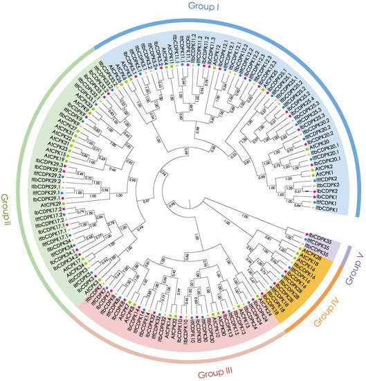A total of 109 CDPKs (i.e., 39 in I. batatas, 35 in I. trifida, and 35 in I. triloba) were identified from the cultivated hexaploid sweet potato and its two diploid relatives. According to the evolutionary distance to AtCPKs, these CDPKs were classified into five subgroups (group I to V), with one more group than CDPKs in other species (group I to IV) [3,9,10,11,12]. Ib/Itf/ItbCDPK35 in group V have no homologous protein in Arabidopsis, meaning group V in sweet potato is unique. We also observed that the number of CDPKs varied between sweet potato and its two diploid relatives. Thirty-nine IbCDPKs were distributed across the genome in I. batatas (Figure 1A). While the number of CDPKs identified in I. trifida was the same as that in I. triloba but was less than that in I. batatas., supporting the distinct origin during the evolution of hexaploid sweet potato.