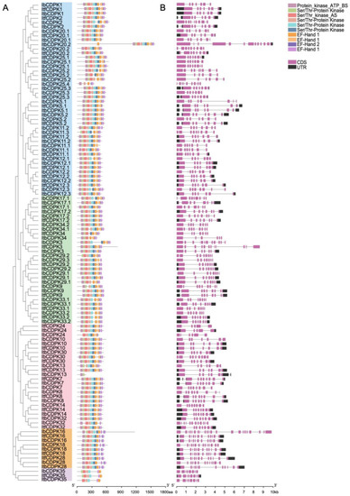 The exon-intron structures of CDPKs were obtained by GSDS 2.0 (http://gsds.gao-lab.org/ accessed on 29 January 2022) and were visualized by the TBtools software. The cis-elements in the approximately 2000 bp promoter region of CDPKs were predicted by PlantCARE (http://bioinformatics.psb.ugent.be/webtools/plantcare/html/ accessed on 30 January 2022) [65].