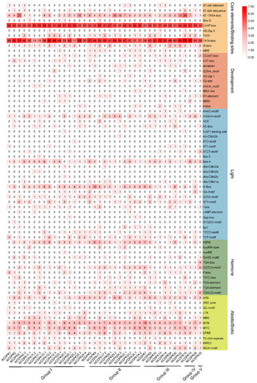 Cis-elements analysis of IbCDPKs. The cis-elements were divided into five groups. The degree of red colors represents the number of cis-elements upstream of the IbCDPKs.
