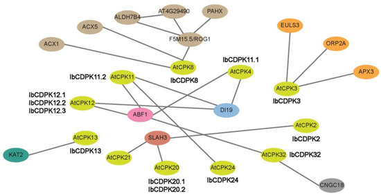 Protein interaction network of IbCDPKs in I. batatas according to orthologues in Arabidopsis. Network nodes represent proteins, green nodes represent AtCPKs and other colored nodes represent interacting proteins. Lines represent protein–protein interaction which was experimentally determined.