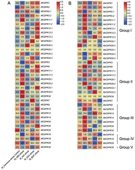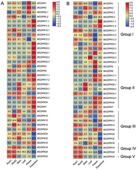 Variation in gene expression between homolog CDPKs was also observed. RNA-seq data of six tissues (i.e., flower, flower bud, leaf, root 1, root 2, and stem) were used to analyze the expression patterns of ItfCDPKs and ItbCDPKs in I. trifida and I. triloba, respectively [38] (Figure 7). In I. trifida, eight ItfCDPKs (i.e., ItfCDPK5.2, -12.1, -9, -10, -14, -18, -28, and -35) were highly expressed in the root (root1 and root2). Five ItfCDPKs (i.e., ItfCDPK12.2, -29.1, -29.2, -33.1, and -32) were highly expressed in the stem. No ItfCDPKs were highly expressed in the leaf. Only two ItfCDPKs (i.e., ItfCDPK1 and ItfCDPK2) were highly expressed in the flower. Fourteen of thirty-five ItfCDPKs (i.e., ItfCDPK11.1, -11.2, -20.1, -20.2, -25.1, -25.2, -25.3, -17.1, -17.2, -33.2, -34, -7, -24, and -16) were highly expressed in flowerbud. Furthermore, ItfCDPK12.3, -8, and -30 showed low expression in all tissues, and ItfCDPK12.3 showed the lowest expression in the flower, while ItfCDPK30 had the lowest expression in the flower bud. ItfCDPK5.1 and ItfCDPK3 were highly expressed in the stem and flower, while ItfCDPK13 was highly expressed in the stem and flowerbud (Figure 7A).