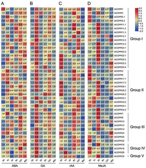 Gene expression patterns of IbCDPKs in response to different phytohormones, i.e., (A) ABA, (B) GA, (C) IAA, and (D) MeJA of I. batatas. The values were determined by RT-qPCR from three biological replicates consisting of pools of three plants, and the results were analyzed using the comparative CT method. The expression of 0 h in each treatment was considered “1”. The fold change is shown in the boxes. Different lowercase letters indicate significant differences (p < 0.05; Student’s t-test).