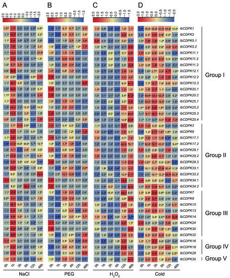 Gene expression patterns of IbCDPKs in response to abiotic stresses, i.e., (A) NaCl, (B) PEG, (C) H2O2, and (D) cold, of I. batatas. The values were determined by RT-qPCR from three biological replicates consisting of pools of three plants, and the results were analyzed using the comparative CT method. The expression of 0 h in each treatment was considered “1”. The fold change is shown in the boxes. Different lowercase letters indicate significant differences (p < 0.05; Student’s t-test).