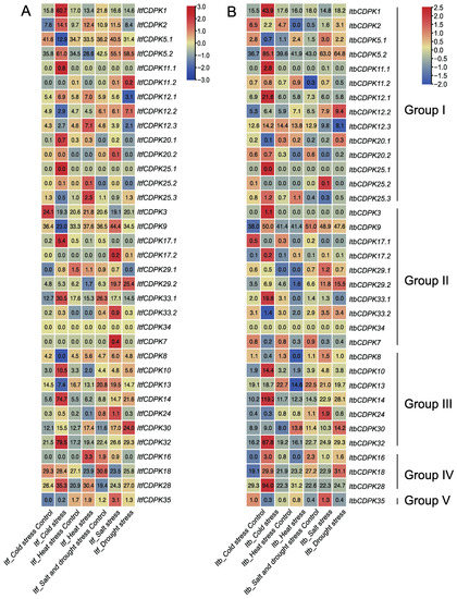 Gene expression patterns of ItfCDPKs (A) and ItbCDPKs (B) under abiotic stress (cold, heat, salt, and drought) in I. trifida and I. triloba as determined by RNA-seq. Log2 (FPKM+1) is shown in the boxes.