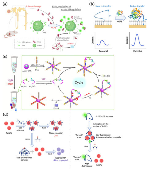 - Hu, Y.; Yu, X.; Zhang, Y.; Zhang, R.; Bai, X.; Lu, M.; Li, J.; Gu, L.; Liu, J.-H.; Yu, B.-Y.; et al. Rapid and Sensitive Detection of NGAL for the Prediction of Acute Kidney Injury via a Polydopamine Nanosphere/Aptamer Nanocomplex Coupled with DNase I-Assisted Recycling Amplification. Analyst 2020, 145, 3620–3625. [Google Scholar] [CrossRef]