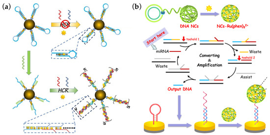 - Xu, Y.; Zhang, Y.; Sui, X.; Zhang, A.; Liu, X.; Lin, Z.; Chen, J. Highly Sensitive Homogeneous Electrochemiluminescence Biosensor for MicroRNA-21 Based on Cascaded Signal Amplification of Target-Induced Hybridization Chain Reaction and Magnetic Assisted Enrichment. Sens. Actuators B Chem. 2021, 344, 130226. [Google Scholar] [CrossRef]