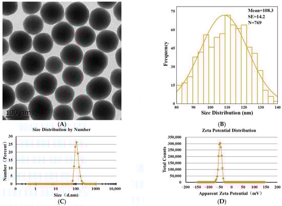 Transmission electron microscopy (TEM) image showed that SNPs were spherical with low polydispersity (Figure 1A). The size distribution indicated that the average diameter of the particles was 108.3 ± 14.2 nm (Figure 1B). The representative hydrodynamic diameter of SNPs in 10 mM NaCl, following the NIST-NCL protocol [], was 110.8 ± 26.5 nm, with a PDI of 0.02 (Figure 1C). The zeta potential of SNPs measured in 10 mM NaCl, following the NCL protocol [], was −49.7 ± 6.6 mV (Figure 1D).
