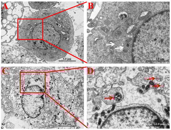 Cellular internalization and localization of SNPs in PLCs. (A) TEM image of PLCs in the control group (without SNP exposure). (B) Zoomed in image of the red box marked in A. White arrows indicate that vesicles did not include SNPs in granulosa cells. (C) TEM image of PLCs exposed to 100 µg/mL SNPs. (D) Zoomed in image of the red box in C. Red arrows indicate that vesicles enclosed SNPs in the cytoplasm of granulosa cells. Scale bar, 5.0 µm (A,C) and 2.0 µm (B,D).