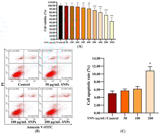 Effect of SNPs on cell viability in PLCs. (A) CCK-8 assay of the effect of SNPs on cell viability in PLCs. Cells were exposed to 0, 50, 100, 200, 300, 400, 500, 600, 800, and 1000 µg/mL SNPs for 24 h. (B) Flow cytometry analysis of the effect of SNPs on cell apoptosis in PLCs. After exposure to 0, 50, 100, and 200 µg/mL SNPs for 24 h, PLCs were collected for annexin V-FITC/PI staining. The UL quadrant indicates cell death caused by mechanical damage or necrotic cells, the UR quadrant indicates late apoptotic cells, the LL quadrant indicates normal cells, and the LR quadrant indicates early apoptotic cells. (C) The quantification of cell apoptosis in B is shown in the bar graphs. Data are presented as the mean ± SEM of three independent experiments. * Statistically different from the control (* p < 0.05, ** p < 0.01, and *** p < 0.001).
