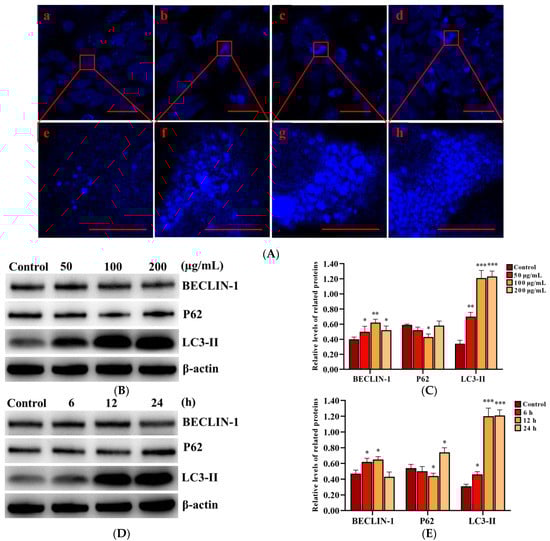 Effect of SNPs on the activation of autophagy in PLCs. (A) Fluorescence images of MDC staining. PLCs were exposed to 0, 50, 100, and 200 µg/mL SNPs for 12 h. Scale bar: 50 µm (Aa–d) and 10 µm (Ae–h). (B) Western bolt analysis of BECLIN-1, P62, and LC3-II levels. PLCs were exposed to 0, 50, 100, and 200 µg/mL SNPs for 12 h. (C) Quantification of the band intensity in B is presented as the relative ratio of target proteins to β-actin. (D) Western bolt analysis of BECLIN-1, P62, and LC3-II levels. PLCs were exposed to 100 µg/mL SNPs for 0, 6, 12, and 24 h. (E) Quantification of the band intensity in D is presented as the relative ratio of target proteins to β-actin. Data are presented as the mean ± SEM of three independent experiments. * Statistically different from the control is marked with asterisks (* p < 0.05, ** p < 0.01, and *** p < 0.001).