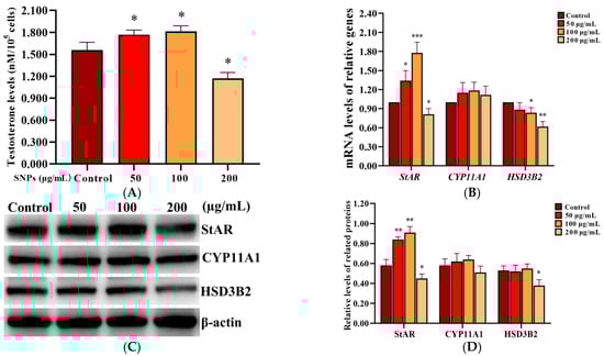 Effect of SNPs on the secretion of testosterone in PLCs. (A) Detection of the concentration of testosterone via ELISA analysis in the PLC culture supernatant. (B) Measurement of StAR, CYP11A1, and HSD3B2 mRNA levels in PLCs via qRCR analysis. (C) Determination of the levels of StAR, CYP11A1, and HSD3B2 proteins in PLCs via western blot analysis. PLCs were exposed to 0, 50, 100, and 200 µg/mL SNPs for 12 h, respectively. (D) Quantification of the band intensity in C was presented by the relative ratio of target proteins to β-actin. Data are presented as the mean ± SEM of three independent experiments. * Statistically different from the control (* p < 0.05, ** p < 0.01, and *** p < 0.001).