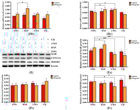 To evaluate the effect of SNP-activated autophagy on testosterone secretion, PLCs were dosed with 100 µg/mL SNPs and pre-exposed to the autophagy activator RAP, as well as the inhibitors 3-MA and CQ. Western blot analysis showed that the BECLIN-1 protein level was significantly increased in the RAP + SNP-exposed group and significantly decreased in the 3-MA + SNP and the CQ + SNP-exposed groups compared to the SNP-only group (Figure 6A,Ba). P62 exhibited no significant difference in the RAP + SNP-exposed group and was significantly increased in the 3-MA + SNP and CQ + SNP-exposed groups compared to the SNP-only group (Figure 6A,Bb). LC3-II exhibited no significant difference in the RAP + SNP-exposed group and was significantly decreased in the 3-MA + SNP-exposed group and the CQ + SNP-exposed group compared to the SNP-only group (Figure 6A,Bc). ELISA analysis showed that the concentration of testosterone was significantly increased in the RAP + SNP-exposed group and significantly decreased in the 3-MA + SNP and the CQ + SNP-exposed groups compared to the SNP-only group (Figure 6C). qRCR analysis showed that StAR mRNA levels were significantly increased in the RAP + SNP-exposed group and significantly decreased in the 3-MA + SNP and the CQ + SNP-exposed groups compared to the SNP-only group (Figure 6Da). CYP11A1 was significantly increased in the RAP + SNP-exposed group, with no significant difference in the 3-MA + SNP and the CQ + SNP-exposed groups compared to the SNP-only group (Figure 6Db). HSD3B2 significantly increased in the RAP + SNP and the 3-MA + SNP-exposed groups and significantly decreased in the CQ + SNP-exposed group compared to the SNP-only group (Figure 6Dc). Western blot analysis showed that the StAR protein level was significantly increased in the RAP + SNP-exposed group and significantly decreased in the 3-MA + SNP and the CQ + SNP-exposed groups compared to the SNP-only group (Figure 6E,Fa). CYP11A1 exhibited no significant difference in all groups (Figure 6E,Fb). HSD3Β2 had no significant difference in the RAP + SNP-exposed group and was significantly decreased in the 3-MA + SNP and the CQ + SNP-exposed groups compared to the SNP-only group (Figure 6E,Fc).