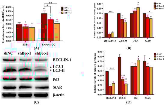 BECLIN-1 shRNA recombinant lentivirus vectors (shBec-1 and shBecl-2) and a negative control shRNA vector (shNC) were constructed. The sequences of the shRNAs are listed in Table 1. The process of lentivirus packaging was reported in our previous study []. Briefly, recombinant lentivirus vectors and packaging vectors (pGag/Pol, pRev, and pVSV-G) were co-transfected into HEK 293T cells. After transfection for 48 h, the lentivirus supernatants were harvested, purified, filtered, concentrated, and stored at −80 °C. PLCs were transduced with an appropriate number of lentiviral particles (multiplicity of infection (MOI) = 20) containing 8 µg/mL polybrene in DMEM/F12. After transduction for 12 h, the lentivirus-containing medium was removed and replaced with fresh DMEM/F12 for another 48 h. Next, the cells were exposed to 100 µg/mL SNPs for 12 h. Finally, the cells and supernatants were harvested for testosterone measurement.