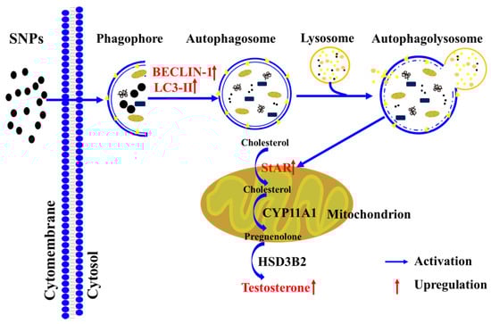 An increasing number of studies is focusing on the male reproductive toxicity of SNPs [,,,,]. SNPs can penetrate the mouse blood–testis barrier and exert their toxic actions. After intravenous [], intramuscular [], or inhalation [] exposure, SNPs have been observed to accumulate in the testes, impairing spermatogenesis and decreasing sperm quality and quantity. The testicular toxicity of SNPs can affect spermatogenesis, as well as testosterone level. Leydig cells are one of the important components of the testes and mainly participate in testosterone synthesis and secretion []. However, less attention is paid to the toxicity of Leydig cells after SNP exposure. In the current study, we demonstrate that low doses of SNPs can activate autophagy and enhance testosterone secretion in mouse Leydig cells.