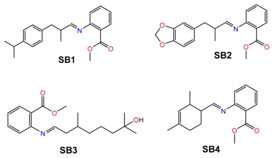 Four SBs were synthesized, starting from methyl anthranilate (MA) and four odorant aldehydes (A): cyclamal (A1), helional (A2), hydroxycitronellal (A3) and triplal (A4), throughout the intermediate formation of a carbinolamine and the final release of a water molecule (Scheme S1) [16,40,41,42,43,44]. The aldehydes are all chiral compounds and are used in the racemic form. The structures of the final SBs (SB1–SB4) are reported in Figure 1.