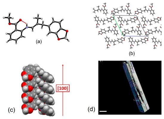 Structural features of crystalline SB2: (a) the asymmetric unit, showing the intramolecular S11(6) hydrogen bonding interaction between the iminic nitrogen and carbonyl group, (b) crystal packing viewed down the a-axis, and (c) detail of the columnar stacking extending along the [100] crystallographic direction; (d) optical microscope image (polarized light) of the crystals of SB2. Scalebar is 100 μm.