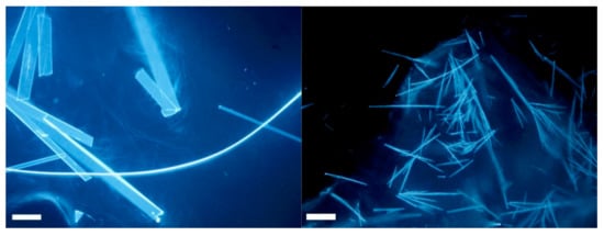 As gels were obtained in all conditions, we prepared ten gels containing the selected gelator in 1% w/v concentration and the selected SB in 0.5% w/v concentration (see Materials and Methods for details). The inspection with a microscope of the gels containing SB2P highlights that some crystals are contained in the gels, as we previously observed for the solutions (Figure 3).