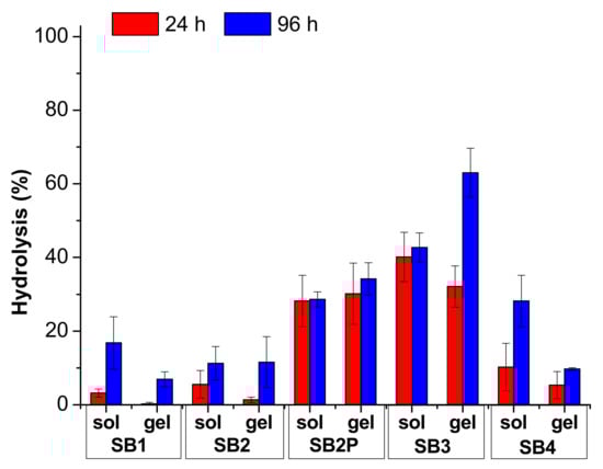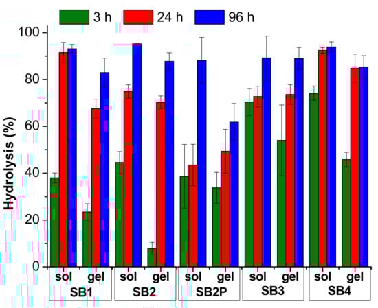 The hydrolysis results are reported in Figure 4 and Figure 5 and in Tables S5 and S6. In Figure 4 and Table S5, we compared the results obtained under neutral conditions, both in solution and in gel. For these measures we analyzed the medium in 70:30 solvent ratio only. In Figure 5 and in Table S6, we collected the results for the hydrolysis under acidic conditions, both in solution and in gel.