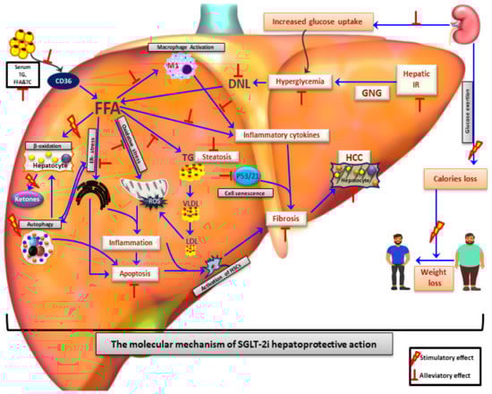 Although the SGLT-2i-induced weight loss seems to play an important role in hepato-protective effects on NAFLD in humans [102,103,104], data from animal studies suggest that other mechanisms are more likely responsible for the noted SGLT-2i-mediated hepato-protection.