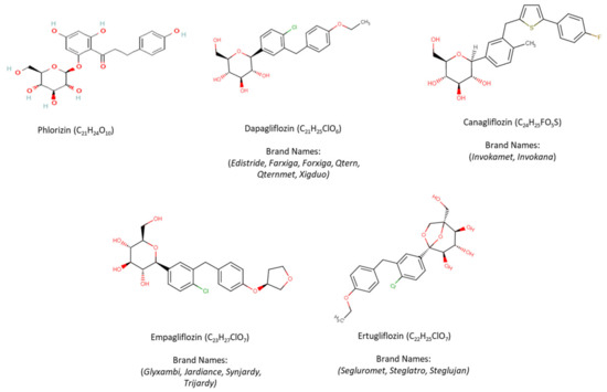 The structure of phlorizin and currently FDA-approved SGLT-2 inhibitors in the United States, including dapagliflozin, canagliflozin, empagliflozin, and ertugliflozin, along with their chemical formulae and brand names are presented in Figure 2 [78]. Diverse structures of other SGLT-2 inhibitors have been previously disclosed in various articles and in a number of patents [79,80].