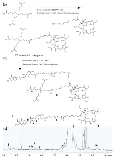Otherwise, FA was attached to the amine group of bifunctional PEG as shown in Figure S1b. After that, the remaining carboxylic acid of the bifunctional PEG was attached with selenocystamine again to produce FA-PEG-sese conjugates (Figure S1b). As shown in Figure S1b, the ethylene protons of PEG were confirmed at 3.4–3.7 ppm, while the specific peaks of FA were confirmed at 1 and 9 ppm. The ethylene group of selenocystamine was confirmed at 2.8–3.4 ppm. Next, four equivalents of the FA-PEG-sese conjugates were conjugated to the carboxyl group of the TA-sese-Ce6 conjugates as shown in Figure 1b. Figure 1c also shows that the 1H NMR spectra showed all of the components of the FAPEGtaCe6 conjugates, the specific peaks of Ce6, selenocystamine, FA, TA and PEG. These results indicate that the FAPEGtaCe6 conjugates were successfully synthesized. Table 1 shows the characteristics of FAPEGtaCe6.