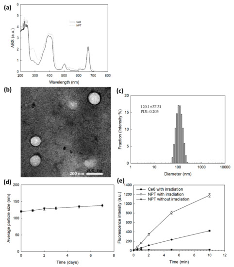 A transmission electron microscope (TEM) (H-7600, Hitachi Instruments Ltd., Tokyo, Japan) was employed to observe the morphology of the nanophotosensitizers. One drop of the nanophotosensitizer aqueous solution was dropped onto the carbon film-coated grid for the TEM. This was dried at room temperature for 3 h. Following this, phosphotungstic acid (0.1%, w/w in deionized water) was used to stain the nanophotosensitizers negatively. The observation was carried out at 80 kV.