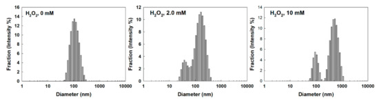 The effect of H2O2 concentration on the changes in particle size distribution. To study ROS sensitivity, nanophotosensitizers in PBS (1 mg/mL) were incubated in the presence of H2O2 at 37 °C for 3 h.