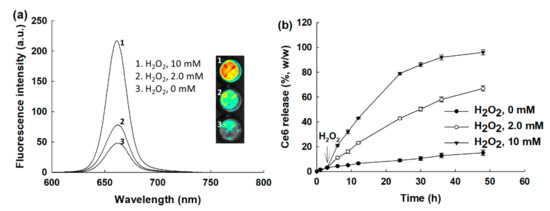 The effect of H2O2 concentration on the changes in the fluorescence emission spectra (a) and drug release (b). To measure fluorescence emission spectra, nanophotosensitizers in PBS (0.1 mg/mL) were incubated in the presence of H2O2 at 37 °C for 3 h.