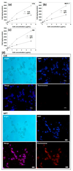 Ce6 uptake of Y79 cells (a), MCF-7 cells (b) and KB cells (c). Fluorescence observation of KB cells with treatment of Ce6 or nanophotosensitizers (d). Bar = 20 µm.