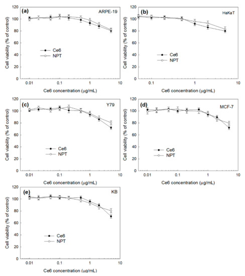 Dark toxicity of free Ce6 and nanophotosensitizers, with normal cell lines such as ARPE-19 cells (a) and HaKaT cells (b) and cancer cell lines such as Y79 cells (c), MCF-7 cells (d) and KB cells (e). NPT = FAPEGtaCe6 nanophotosensitizers.