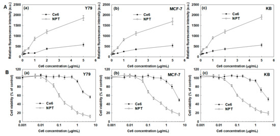 The Y79, MCF-7 and KB cells (2 × 104 cells/well) were seeded in 96 well plates and then exposed to Ce6 or nanophotosensitizers. For the Ce6 treatment, it was dissolved in DMSO and then diluted with serum-free media more than 100 times. The nanophotosensitizers fabricated as described above were diluted with serum-free media. Each treatment was incubated for 2 h in a 5% CO2 incubator at 37 °C. After that, the cells were washed with PBS twice, replaced with 100 µL serum-free media and adopted for PDT treatment. For PDT treatment, the cells were irradiated at 664 nm using an expanded homogenous beam (SH Systems, Gwangju, Korea) at 2.0 J/cm2 (the signal was measured using a photo-radiometer (DeltaOhm, Padova, Italy)). The light intensity of the expanded homogenous beam and irradiation time were 3.515 mW/cm2 and 569 s (2000 mJ/cm2), respectively. After that, the cells were incubated for 24 h in a CO2 incubator at 37 °C. The viability of the cells was evaluated with an MTT proliferation assay, and 30 μL of an MTT solution (5 mg/mL in PBS) was added to the wells and further incubated for 3 h in a CO2 incubator. The supernatants were discarded and replaced with 100 µL DMSO. The absorbance (570 nm) was measured with an Infinite M200 pro microplate reader. All of the procedure was performed in dark conditions.