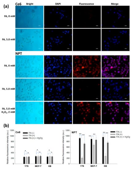 Fluorescence observations of KB cells (a) and intracellular Ce6 uptake against various cancer cells (b). FA (5.0 mM) was pretreated to the KB cells 30 min before treatment of Ce6 or nanophotosensitizers. For H2O2 (2 mM) treatment, Ce6 or nanophotosensitizers were treated to cells, and then H2O2 was added to the medium. Ce6 concentration was 2 µg/mL. Bar = 20 µm. *, ** p < 0.01.