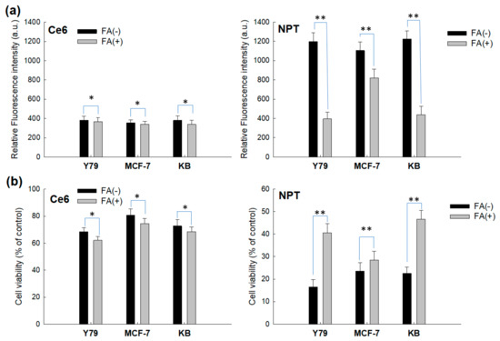 The effect of pretreatment of FA on the intracellular ROS generation (a) and phototoxicity (b). Cells were treated with Ce6 or nanophotosensitizers in a similar manner to Figure 8. FA (5 mM) was pretreated to the cells 30 min before free Ce6 or nanophotosensitizer treatment. Ce6 concentration was 2 µg/mL. Cells were exposed to free Ce6 or nanophotosensitizers for 2 h and then irradiated at 664 nm (2 J/cm2). *, ** p < 0.01.