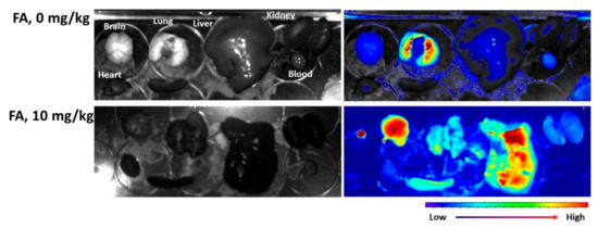 The effect of folate receptor blocking was also assessed with a pulmonary metastasis model of Y79 cells, as shown in Figure 10. For biodistribution of the nanophotosensitizers in mouse organs, the Y79 cells were intravenously (i.v.) administered via the tail veins of the mice. FA (10 mg/kg in 0.1 mL PBS) was i.v. injected to block the folate receptor of the Y79 cells 30 min before injection of the nanophotosensitizers. As shown in Figure 10, the fluorescence intensity without pretreatment of FA (FA, 0 mg/kg) showed a significantly higher fluorescence intensity in the lungs than those of the other organs, indicating that nanophotosensitizers could be efficiently delivered to the pulmonary metastasis of Y79 cells, as shown in Figure 10 (upper images). Otherwise, blocking of the folate receptors of the Y79 cells (FA, 10 mg/kg) in the lungs induced a significant decrease in the fluorescence intensity compared with the other organs. These results indicate that the FAPEGtaCe6 nanophotosensitizers were delivered to the folate receptor positive Y79 cells through a folate receptor-mediated pathway. An in vivo pulmonary metastasis model of the Y79 cells also proved that the FAPEGtaCe6 nanophotosensitizers had targetability against the folate receptors of the tumors.