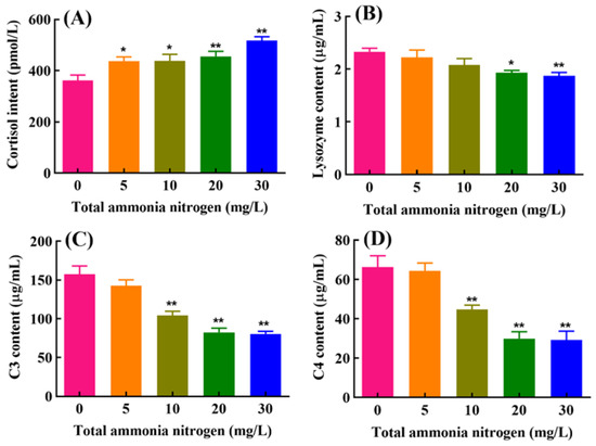 Effects of chronic ammonia exposure on levels of serum cortisol, lysozyme, C3 and C4 (A–D) in M. amblycephala. Each column represents mean ± SE of six duplicates. The values of p < 0.05 and 0.01 are represented as “*” and “**” above the column, indicating significant difference versus control, respectively.