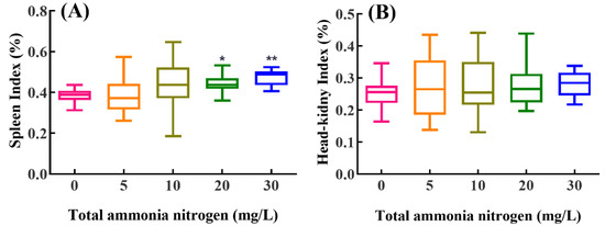 Both the spleen and head-kidney indexes increased with the increase in total ammonia nitrogen concentrations after exposure (Figure 3). Compared with the control group, the spleen index was significantly elevated in the fish treated with higher total ammonia nitrogen (20 and 30 mg/L) (p < 0.05). No significant difference was detected in the head-kidney index between all ammonia treatment groups and control group (p > 0.05).