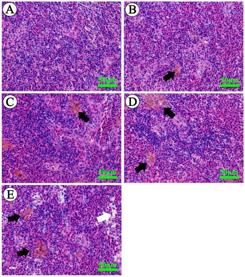 Light microscope photographs of spleens of M. amblycephala (H&E). (A) Spleen tissue of control fish showing normal architecture. (B–D) Spleen tissues from fish exposed to 5, 10 and 20 mg/L ammonia nitrogen showing an increase in erythrocytes and melano-macrophage centers (black arrows). (E) Spleen tissue from fish exposed to 30 mg/L ammonia nitrogen showing increased melano-macrophage centers (black arrows) as well as cytoplasm vacuolization (white arrows). Scale bar = 50 μm.