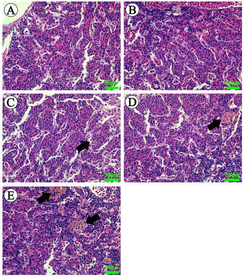 Light microscope photographs of head-kidney tissue of M. amblycephala (H & E). (A,B) The head-kidney of fish exposed to 0 and 5 mg/L ammonia nitrogen showing normal structure. (C–E) The head-kidney from fish exposed to 10, 20 and 30 mg/L ammonia nitrogen showing the increase in melano-macrophage centers in number and size (black arrows). Scale bar = 50 μm.