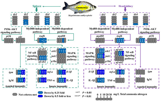 In fact, the immunosuppressive effects of ammonia in fish have been proven to contribute to disease outbreaks [11,12]. In some studies on Takifugu rubripes, Scophthalmus maximus and Pelteobagrus fulvidraco, acute ammonia exposure could upregulate gene expression levels of B-cell activating factor, heat shock protein 70/90, tnf-α, and interleukin-1/1β/6/8/12 [13,14,15]. Wang et al. also reported that serum lysozyme activities were decreased significantly in Acanthopagrus schlegelii after 24 h of ammonia exposure [16]. Similarly, decreased mRNA levels of complement C3 and IgM were observed in the spleens of Pelteobagrus vachellii and Rhynchocypris lagowski under acute ammonia exposure [17,18]. Although much attention has been paid to the effects of acute ammonia exposure on fish immunity, there are only limited studies on the effects of chronic or long-term ammonia stress and its potential molecular mechanism. In addition, some investigators have reported adverse effects of ammonia nitrogen on mRNA expression of TLRs through transcriptional analysis [16,19,20,21,22]. Consequently, we hypothesize that persistent ammonia exposure also could affect fish immunity, in which the TLR signaling pathway might play an important role.