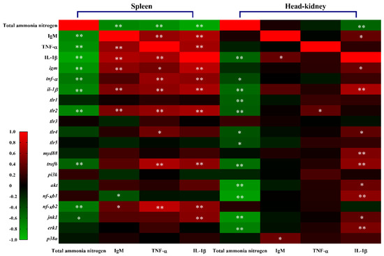 As shown in Figure 7 and Supplementary Table S2, ammonia exposure concentration was significantly negatively correlated with the contents of TNF-α, IL-1β and IgM as well as transcriptional levels of tnf-α, il-1β, igm, tlr2, traf6, nf-кb2 and jnk1 in the spleen. Meanwhile, the contents and transcription levels of splenic TNF-α, IL-1β and IgM exhibited significant positive correlations with each other (p < 0.05). Splenic IgM concentration showed a significant positive correlation with tlr2 and nf-кb2, and TNF-α as well as IL-1β exhibited significant positive correlations with tlr2, traf6 and nf-кb2 (p < 0.05). However, in the head-kidney, ammonia exposure levels were only remarkably negatively correlated with IL-1β content and the expression of genes tnf-α, il-1β, tlr1/2/4/5, traf6, akt, nf-кb1, jnk1 and erk1 (p < 0.05). Head-kidney IL-1β was positively correlated with IgM, igm, il-1β, tlr4, myd88, traf6, akt, nf-кb1, erk1 and jnk1, while IgM and TNF-β exhibited a positive correlation with p38 a and tlr2, respectively (p < 0.05).