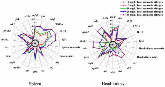 Star plots for biomarker responses in spleen and head-kidney in M. amblycephala exposed to ammonia nitrogen.