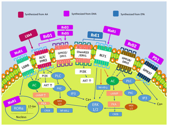 The biological effects of SPMs on cells result from their binding to specific G protein-coupled transmembrane receptors (GPCRs), such as ALX/FPR2, GPR32/DRV1, ChemR23, BLT1, GPR37, and GPR18/DRV2 []. Overall, SPMs share some specific signaling pathways, including intracellular phosphorylation cascades and gene regulation, except for PD1, which increases intracellular calcium and triggers calcium-dependent signaling pathways instead [].