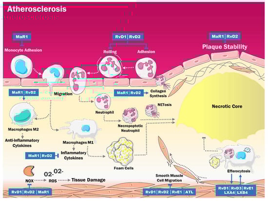 Atherosclerosis is a chronic inflammatory vascular disease characterized by the thickening of the intima due to the accumulation of lipids and macrophages within a core surrounded by a layer of fibrous tissue and smooth muscle. This results in progressive vascular occlusion and the onset of thrombi at any segment of the vascular system, with clinical manifestations such as myocardial ischemia, ischemic stroke, and peripheral arterial disease [,]. Given its inflammatory nature, it does not come as a surprise that recent evidence associated a disbalance of lipid mediators, particularly SPMs, with the progression of the disease. When these lipids are reduced, they may favor chronic inflammation and subsequent vascular tissue damage (Figure 2) [].