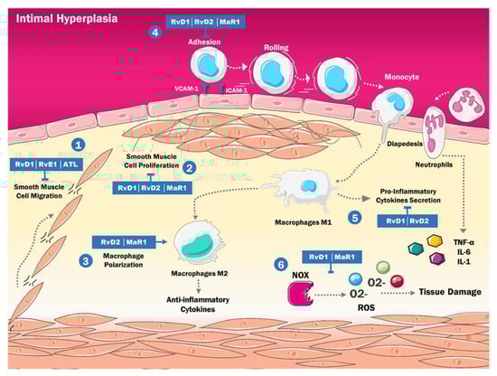 Moreover, SPMs have been proven to regulate the inflammatory environment that triggers intimal hyperplasia via several mechanisms. For example, RvD1, RvD2, and MaR1 decrease the expression of adhesion molecules such as ICAM-1, VCAM-1, and E-selectin, thus regulating the interaction between VSMC and monocytes []. Also, in vitro models have shown decreased expression of multiple inflammatory cytokines such as IL-1a, IL-6, TNF-α, and VSMC-derived ROS in the presence of SPMs [].